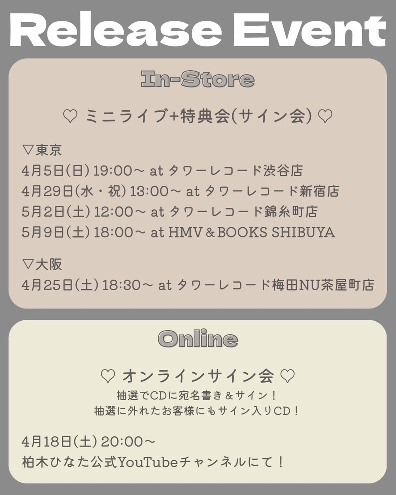 東京・大阪にて、ミニライブとサイン会を実施するほか、オンラインサイン会の配信も予定している。